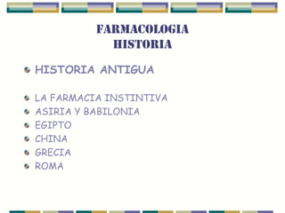 Este documento presenta una introducción a la historia de la farmacología. Comienza describiendo la farmacia instintiva en civilizaciones antiguas como Asiria, Babilonia, Egipto y China, y luego continúa detallando los avances en Grecia, Roma y la Edad Media, culminando con los descubrimientos científicos modernos en farmacología y el surgimiento de la industria farmacéutica en el siglo XIX y XX.