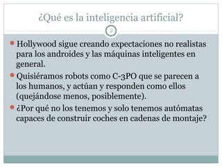 El documento introduce la inteligencia artificial y discute su historia, definiciones, bases y estado actual. Explica que a pesar de avances, aún no se han logrado máquinas de propósito general ni robots humanoides completamente autónomos, aunque hay éxito en aplicaciones especializadas.