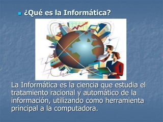 La computadora es una máquina electrónica capaz de procesar información de forma rápida y precisa mediante programación. La informática estudia el tratamiento automático de información utilizando computadoras como herramienta principal. Las computadoras están compuestas por una unidad central de proceso, memoria, dispositivos de entrada y salida y almacenamiento secundario.