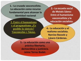 El documento describe el periodo de conciliación y consolidación en la educación mexicana entre 1943-1958. Se enfoca en la labor de Jaime Torres Bodet como secretario de educación pública, quien buscó elevar la calidad de la enseñanza de la historia y el civismo. También describe el Plan de Once Años implementado durante este periodo para ampliar la cobertura educativa primaria, formar más maestros, y reducir el analfabetismo.