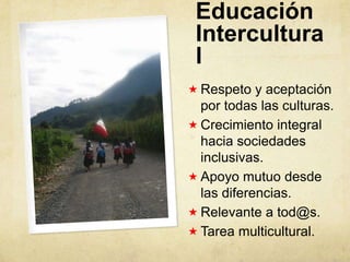 El documento habla sobre un seminario de liderazgo educativo titulado "Liderazgo en la Enseñanza". Una de las presentaciones se titula "La Educación Intercultural como una forma de vida" y es presentada por Iván Osorio Pérez. La presentación discute la importancia de respetar y aceptar todas las culturas, el crecimiento integral hacia sociedades inclusivas, y el apoyo mutuo desde las diferencias. También menciona algunas leyes y documentos que sitúan la educación intercultural como relevante para todos.