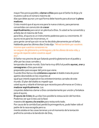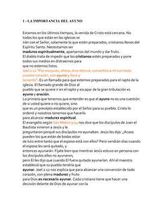 El documento habla sobre la importancia del ayuno para los creyentes. Explica que el ayuno es un mandato de Dios para alcanzar madurez espiritual y estar preparados para la segunda venida de Cristo. También menciona que el ayuno fortalece la fe, rompe las ataduras satánicas, y es necesario para echar fuera ciertos demonios. El documento enfatiza que los creyentes deben dedicar tiempo frecuente al ayuno y la oración para crecer en su relación con Dios.