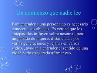 El documento presenta a las cuatro mujeres mencionadas en la genealogía de Jesús en el Evangelio de Mateo: Tamar (la incestuosa), Rahab (la prostituta), Rut (la excomulgada) y Betsabé (la adultera). Incluir los nombres de estas mujeres en la lista de antepasados masculinos era revolucionario para la época, dado el desprecio hacia las mujeres. Mateo incluyó sus nombres para mostrar que Jesús vino a liberar a todos, incluido grupos marginados como mujeres.