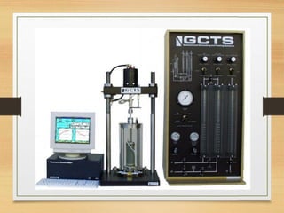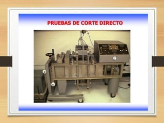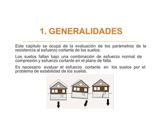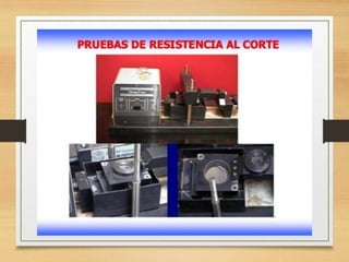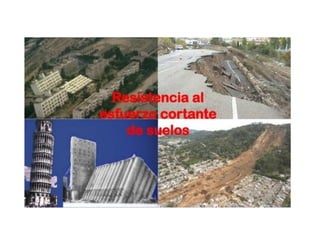 Este documento trata sobre la evaluación de la resistencia al esfuerzo cortante de los suelos. Explica la teoría de Coulomb sobre cómo los suelos fallan bajo una combinación de esfuerzo normal y esfuerzo cortante, y la necesidad de considerar la presión de poros. También describe métodos para medir parámetros como la cohesión y ángulo de fricción interna a través de ensayos de corte directo, compresión simple y corte triaxial.