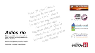 El documento narra la compleja historia de la represa de Urrá en Colombia, destacando la violencia y el desplazamiento forzado que sufrieron los pueblos indígenas, especialmente los embera, en el contexto de la lucha por el control de recursos naturales. A través de testimonios y análisis de documentos oficiales, se evidencia la falta de consulta previa y el impacto devastador del conflicto armado sobre estas comunidades. Se plantea que la situación suscita un grave riesgo para la vida y cultura de los embera, atrapados entre el avance del paramilitarismo, el narcotráfico y los intereses económicos del estado y las empresas.