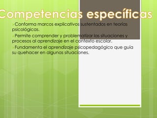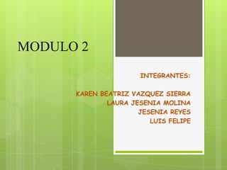 Este documento presenta la información sobre el Módulo 2 de un curso, incluyendo los integrantes del equipo y las teorías psicológicas del aprendizaje que fundamentan el currículo escolar. Se analizarán modelos educativos recientes para identificar las teorías en las que se basan y cómo estas se han traducido en el diseño del currículo. Los estudiantes elaborarán una línea de tiempo y un ensayo crítico sobre reformas curriculares.