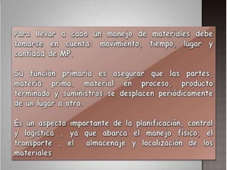 El documento trata sobre el manejo de materiales en la producción. Explica que el manejo de materiales incluye consideraciones como el movimiento, ubicación, tiempo, espacio y cantidad de materiales. También habla sobre los riesgos de un manejo ineficiente de materiales como sobrestadía, desperdicio de tiempo de máquinas, lento movimiento de materiales por la planta y problemas en la producción y seguridad. Finalmente, destaca la importancia de redes de flujo de materiales para una gestión eficiente.