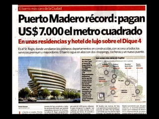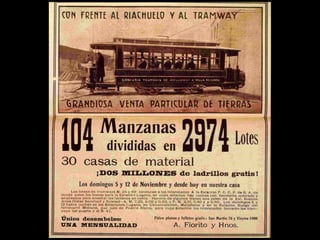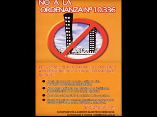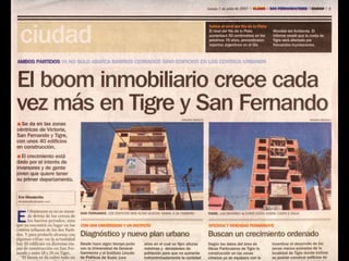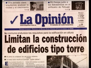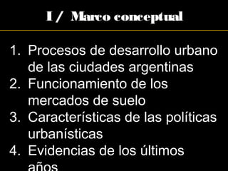 Este documento discute los procesos de desarrollo urbano, funcionamiento de los mercados de suelo y características de las políticas urbanísticas en las ciudades argentinas. Explica que la reproducción de la ciudad es el resultado de la interacción entre la lógica del Estado, el mercado y las necesidades sociales. También analiza cómo los cambios en las normas urbanísticas afectan los precios del suelo y cómo la infraestructura pública genera plusvalías en la tierra. Finalmente, señala que las políticas tradicionales