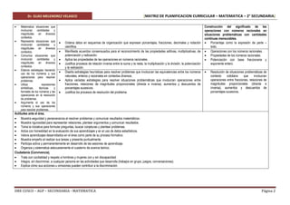 Este documento presenta una matriz de planificación curricular para matemáticas de segundo año de secundaria. Se enfoca en dos dominios: 1) Números y operaciones, con énfasis en representar y operar con números racionales. 2) Cambio y relaciones, con énfasis en patrones geométricos, progresiones aritméticas, variables y ecuaciones lineales. El objetivo es que los estudiantes puedan resolver problemas matemáticos usando diferentes estrategias y justificando sus procedimientos.