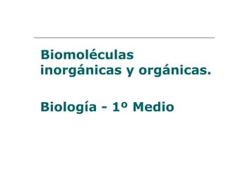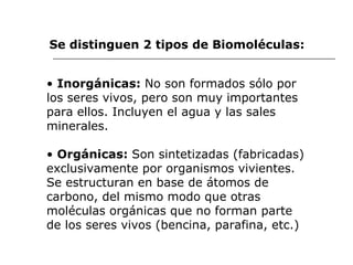 El documento describe las principales biomoléculas inorgánicas y orgánicas. Las inorgánicas incluyen el agua y sales minerales, mientras que las orgánicas como carbohidratos, lípidos, proteínas y ácidos nucleicos son sintetizadas por organismos vivos. El agua es esencial para la vida y constituye la mayor parte de la masa celular, mientras que las sales minerales participan en procesos como la conducción nerviosa y muscular.