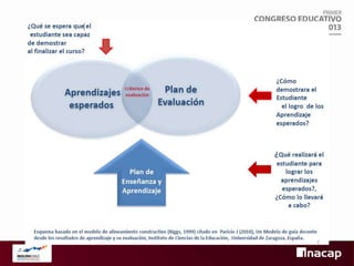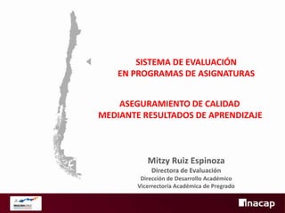 Este documento describe el sistema de evaluación de programas de asignaturas en INACAP para asegurar la calidad mediante resultados de aprendizaje. La evaluación verifica si las experiencias educativas cumplen con los resultados de aprendizaje propuestos, mide el nivel de aprendizaje alcanzado por los estudiantes, y ayuda a identificar áreas que necesitan más atención. La evaluación incluye momentos de diagnóstico, formativa y sumativa, usando evidencias como pruebas concretas del logro del aprendizaje y herramient