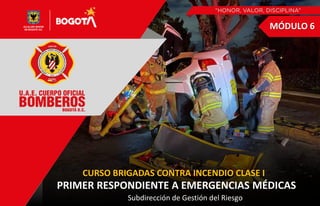 Este documento presenta los objetivos y contenidos de un curso sobre primeros respondientes a emergencias médicas. El curso busca desarrollar las técnicas y procedimientos adecuados para la atención de emergencias prehospitalarias, incluyendo la identificación del primer respondiente y sus responsabilidades, el uso correcto del equipo de protección personal, los pasos para la evaluación y atención inicial de pacientes, y las técnicas para atender obstrucciones, hemorragias, fracturas y quemaduras, así como para el transporte seguro de pac