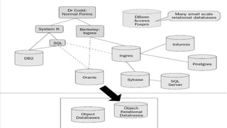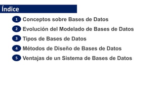 Este documento presenta un resumen de los conceptos básicos sobre bases de datos, incluyendo la evolución de los modelos de bases de datos, los tipos principales de bases de datos, los métodos de diseño de bases de datos y las ventajas de los sistemas de bases de datos. Explica brevemente los modelos jerárquico, de red y relacional, así como los enfoques emergentes como Hadoop, entidad-atributo-valor y NoSQL.