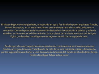 El Museo Egipcio de El Cairo alberga más de 120.000 piezas arqueológicas de Egipto desde el período predinástico hasta el Imperio Romano, ordenadas cronológicamente. Sobresale por la cantidad y calidad de sus colecciones, como el tesoro de Tutankamón descubierto en 1922. Algunas de sus piezas más destacadas son la Paleta de Narmer, las estatuas de Rahotep y Nofret, y la máscara funeraria de oro de Tutankamón. Más de 2,5 millones de