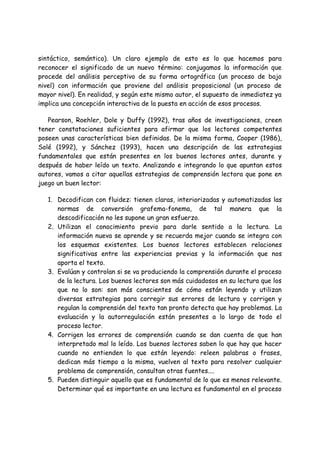 Este documento describe los procesos involucrados en la lectura, incluyendo procesos de bajo nivel como la decodificación y procesos de alto nivel como la interpretación semántica. Explica que los lectores competentes usan estrategias como activar conocimiento previo, hacer inferencias, monitorear la comprensión y corregir errores. Finalmente, resume las características de un lector competente según varios autores.