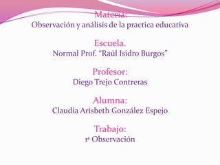 El resumen describe una observación de 3 días en una escuela primaria. La escuela está bien equipada y tiene alrededor de 417 estudiantes. Durante las observaciones, se vieron diferentes materias como matemáticas, ciencias sociales y geografía. La maestra no parece tener un orden claro para sus clases. Los estudiantes participan y la maestra los corrige cuando es necesario. Se entrevistó a la maestra, quien ha estado enseñando por 28 años, y a la directora sobre las normas y su oposición a las pruebas de evaluación
