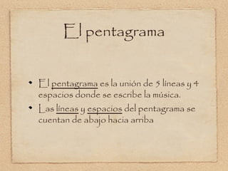 El documento explica los conceptos básicos de la música, incluyendo el pentagrama (que consta de 5 líneas y 4 espacios para escribir la música), la clave de sol (que se coloca al principio del pentagrama y da nombre a las notas dependiendo de su posición) y las 7 notas musicales más comunes (do, re, mi, fa, sol, la, si).