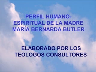El documento describe el perfil humano-espiritual de María Bernarda Butler, una monja franciscana suiza del siglo XX. Tuvo una infancia sencilla dedicada al trabajo agrícola y sintió un fuerte llamado a la oración. Vivió una vida espiritual intensa caracterizada por la pobreza, la obediencia, la mortificación y el servicio a los demás. Reformó su monasterio y demostró ser una sabia administradora y misionera dedicada a unir contemplación y apostolado.