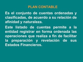 El documento describe el Plan Contable General Empresarial (PCGE) vigente en Perú. Explica que el PCGE proporciona una estructura de códigos para que las empresas registren sus transacciones de acuerdo con las Normas Internacionales de Información Financiera adoptadas en Perú. El PCGE contiene definiciones de cuenta, métodos de reconocimiento y medición de acuerdo con las NIIF para facilitar la preparación de estados financieros estandarizados.