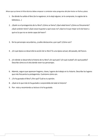 El documento presenta un plan lector para estudiantes de 2o de ESO. Incluye instrucciones para completar una ficha de lectura sobre un libro asignado y responder preguntas sobre el argumento, personajes, contexto y opinión personal. Los estudiantes deben entregar el trabajo antes del 31 de octubre mostrando cuidado en la presentación y ortografía.