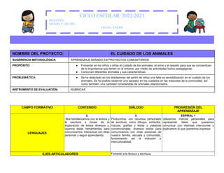 Este proyecto busca fomentar el cuidado y respeto de los animales en los niños a través de actividades lúdicas. Se ha detectado una falta de sensibilización sobre el cuidado de las mascotas y animales abandonados en la comunidad. El proyecto utilizará rúbricas para evaluar el aprendizaje de los niños sobre las características y necesidades de los animales, así como la importancia de su cuidado.