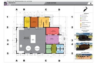 Este documento presenta los planos de una planta procesadora de lácteos. El plano muestra las diferentes áreas de la planta como recepción, administración, salas de maduración, laboratorio de almacenamiento, sala de proceso y distribución. También incluye vistas laterales y frontales de la planta con las cotas correspondientes.