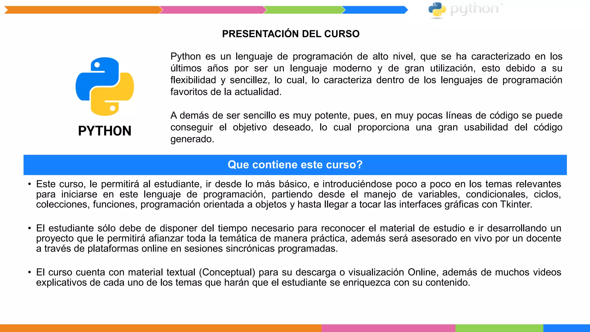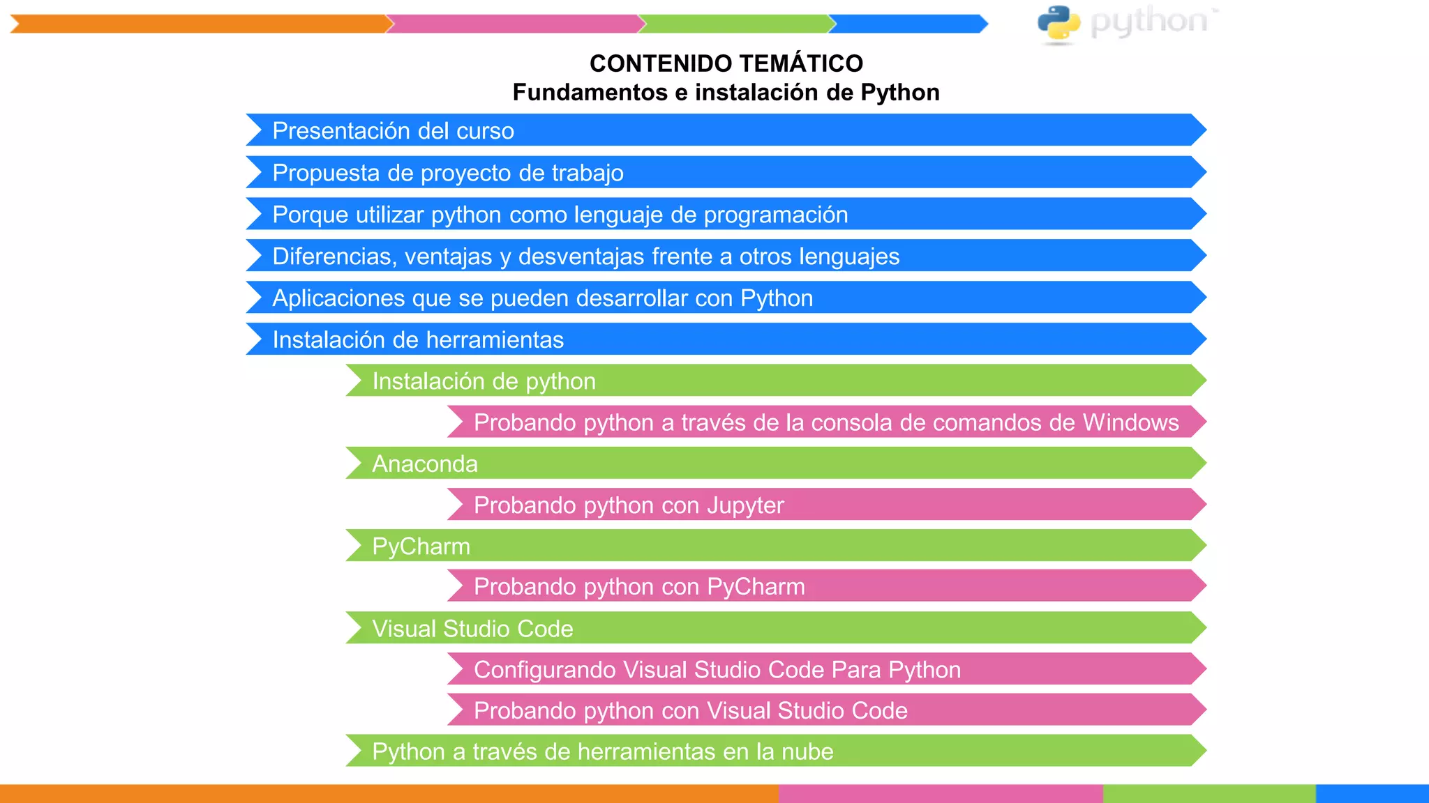 Este documento presenta una introducción al curso de Python, incluyendo la instalación de herramientas como Anaconda, PyCharm y Visual Studio Code, y cómo probar Python a través de ellas. También describe por qué Python es un popular lenguaje de programación y las aplicaciones que se pueden desarrollar con él.