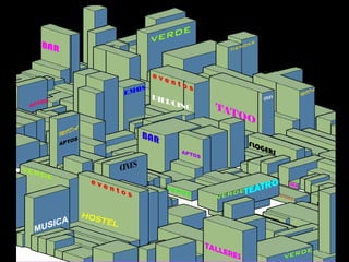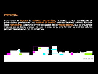 Este documento propone reestructurar la programación urbana inyectando variedad y aprovechando los vacíos urbanos. Se define el vacío como un espacio sin uso o construcciones que podría usarse temporalmente. Se propone inyectar programas para jóvenes en los vacíos, como cultura, recreación, educación y vivienda, para generar movimiento. Se clasifican los programas como móviles, fijos e intermitentes. La gestión incluye incentivar el alquiler para jóvenes, usar el verde público, promover cambios