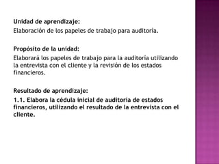 Este documento presenta información sobre la elaboración de papeles de trabajo para auditoría. Explica que el auditor visita las instalaciones de la empresa cliente para obtener información a través de entrevistas con ejecutivos. Luego, el auditor elabora una cédula inicial de auditoría que resume datos generales de la empresa y los resultados de la visita, para determinar los honorarios profesionales, la capacidad del despacho y el personal necesario para realizar la auditoría.