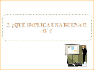 Este documento proporciona información sobre las presentaciones audiovisuales efectivas. Explica que una buena presentación requiere trabajo previo, organización y una buena exposición. Detalla los pasos para la organización como preparar el contenido, titulares, color de fondo, y limitar el texto. Finalmente, discute la importancia de las presentaciones audiovisuales en el aula para mejorar el proceso de enseñanza y aprendizaje.