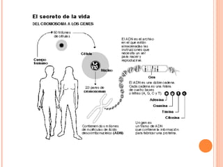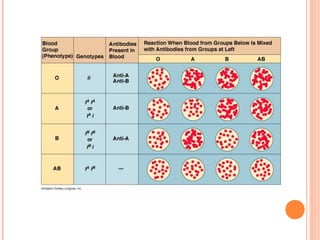 Este documento presenta conceptos básicos de genética como genotipo, fenotipo, alelos, dominancia, codominancia, haploide, diploide y más. Explica los grupos sanguíneos humanos ABO como un ejemplo de codominancia, donde los alelos A y B son codominantes y producen diferentes antígenos en la superficie de los glóbulos rojos, mientras que el alelo O es recesivo.