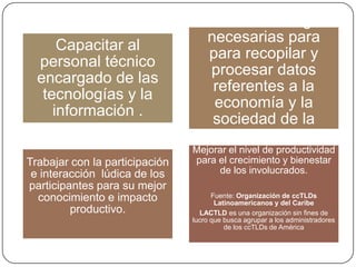 El documento propone varias acciones para promover el desarrollo de la sociedad de la información en un país, incluyendo el intercambio de conocimientos tecnológicos entre instituciones, abrir espacios digitales gratuitos para la educación, dotar de soporte informático a las escuelas públicas, crear software libre para la política y economía, capacitar a la población en TIC de manera integrada y brindar soporte técnico, enfocarse en la participación de jóvenes, y establecer redes de investigación y educ