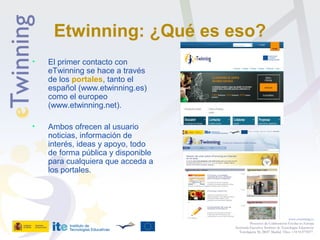 Este documento proporciona información sobre eTwinning, una iniciativa de la Unión Europea que fomenta la colaboración entre escuelas y docentes de diferentes países europeos a través de proyectos educativos conjuntos utilizando las TIC. Explica qué es eTwinning, cómo funciona, los beneficios para estudiantes y docentes, cómo registrarse, encontrar socios y desarrollar proyectos.