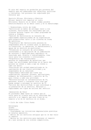 El documento presenta una introducción a ITIL (Information Technology Infrastructure Library), un marco de trabajo de mejores prácticas para la gestión de tecnologías de la información. Explica que ITIL promueve la calidad en la entrega de servicios TI, la alineación de TI con el negocio, y la reducción de costos a través de procesos estandarizados e independientes de proveedores. También define conceptos clave como servicio, gestión de servicios, proceso y ciclo de vida en ITIL.
