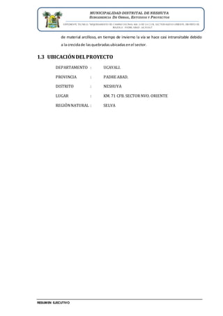 Este proyecto tiene como objetivo mejorar un camino vecinal de 5.733 km en el distrito de Neshuya, Ucayali para proporcionar un mejor acceso a 2,345 habitantes. El camino actual se encuentra en mal estado y es casi intransitable durante la estación lluviosa. El proyecto incluye la construcción de alcantarillas, puentes y el mejoramiento del camino para facilitar el transporte de productos agrícolas al mercado y mejorar las condiciones de vida de los residentes locales.