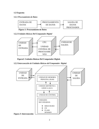 Este documento proporciona una introducción a los conceptos básicos de informática. Define términos clave como computador, hardware, software, proceso, datos e información. Explica el esquema básico de procesamiento de datos y las unidades principales de un computador digital. Luego describe las unidades de almacenamiento de datos e información, los sistemas de numeración y conversiones. Finalmente, cubre los diferentes tipos de hardware, software, sistemas operativos como DOS y Windows. En resumen, ofrece una visión general integral de los fundamentos de la informática