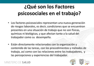 Este documento define los factores psicosociales en el trabajo como condiciones no físicas, químicas o biológicas presentes en el lugar de trabajo que afectan la salud y el desempeño de los trabajadores. Algunos ejemplos de factores psicosociales incluyen horarios de trabajo, carga laboral, relaciones interpersonales y satisfacción en el trabajo. Estudios pilotos han encontrado que actividades como meditación, yoga y ejercicios pueden reducir los sentimientos de estrés en los empleados.