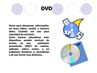 Este documento describe diferentes herramientas tecnológicas como DVDs, calculadoras, cámaras, computadoras, aulas de medios, software, pizarras electrónicas, celulares, cañones, internet y blogs, y cómo estas pueden ser útiles para educadoras al facilitar la presentación de material y mejorar el aprendizaje de forma dinámica y entretenida para los niños.