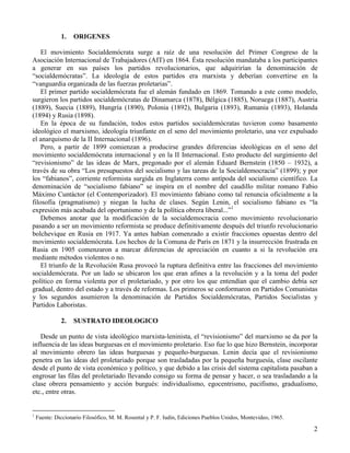 El documento aborda la evolución de la socialdemocracia desde sus orígenes en el siglo XIX, destacando su transición de un movimiento revolucionario inspirando a partidos marxistas a una ideología reformista influenciada por el liberalismo burgués. Describe cómo las divisiones ideológicas y la crítica del revisionismo llevaron a la socialdemocracia a rechazar la lucha de clases en favor de la colaboración entre clases y reformas dentro del sistema capitalista. Finalmente, se presenta una clasificación histórica de la socialdemocracia en tres etapas, cada una respondiendo a diferentes contextos económicos y políticos.
