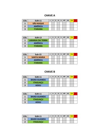 Este documento presenta el calendario y resultados de la 1a Supercopa de los Campeones de la Liga Serrana de Fútbol Infantil de Santa María de Jetibá en 2012. La competencia consistió en dos grupos (Llave A y Llave B) seguidos de semifinales y finales. Se proporciona la tabla de posiciones y goles de cada categoría así como los goleadores y tarjetas amarillas y rojas.