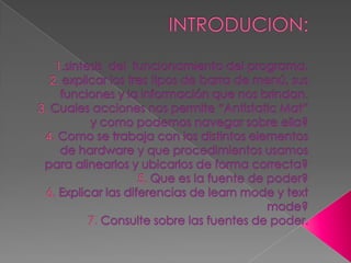 Este documento resume los diferentes modos y componentes de un programa de simulación de ensamblaje de computadoras. Incluye tres modos: aprendizaje, prueba y explorar. El modo de aprendizaje guía el ensamblaje paso a paso, el modo de prueba permite ensamblar sin guía, y el modo de explorar proporciona información sobre los componentes. La alfombra antiestática contiene las piezas y se puede navegar entre ellas. La fuente de alimentación proporciona energía a la tarjeta madre