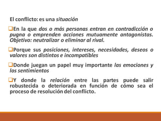 El documento presenta una introducción a la teoría del conflicto. Explica que el conflicto surge cuando hay posiciones, intereses o necesidades incompatibles entre dos o más partes. Luego, describe algunas fuentes comunes de conflicto como percepciones distintas de la realidad, desacuerdos sobre recursos escasos, valores o necesidades. Finalmente, resume las etapas típicas de un conflicto, incluyendo su formación, intensificación, resolución y reconciliación.