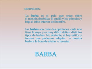 Este documento describe los diferentes tipos de barbas, incluyendo su definición, clasificación según la forma del rostro, tendencias comunes y algunas curiosidades. Explica que la barba es el pelo que crece en la barbilla, cuello y pómulos, y clasifica los rostros en cuadrado, ovalado y triangular, recomendando diferentes estilos de barba para cada uno. Además, destaca estilos como la rockera, clásica, candado y bigote, así como la moderna barba delgada.