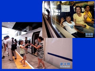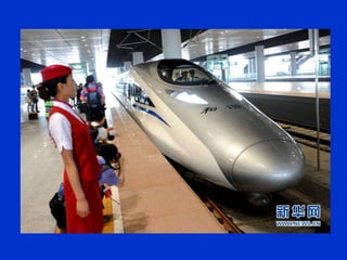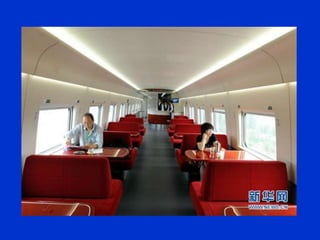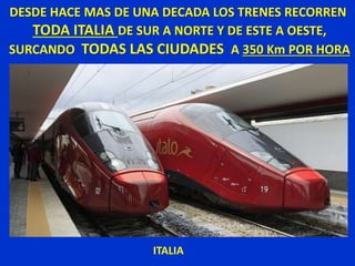 El documento describe los avances en transporte ferroviario de alta velocidad en varios países de Europa y Asia, donde los trenes pueden alcanzar velocidades de más de 350 km/h. En contraste, el documento critica los sistemas de transporte obsoletos y deficientes en algunas comunidades que carecen de infraestructura moderna y tecnología eficiente, y sugiere que los políticos engañan a los ciudadanos sobre las mejoras realizadas.