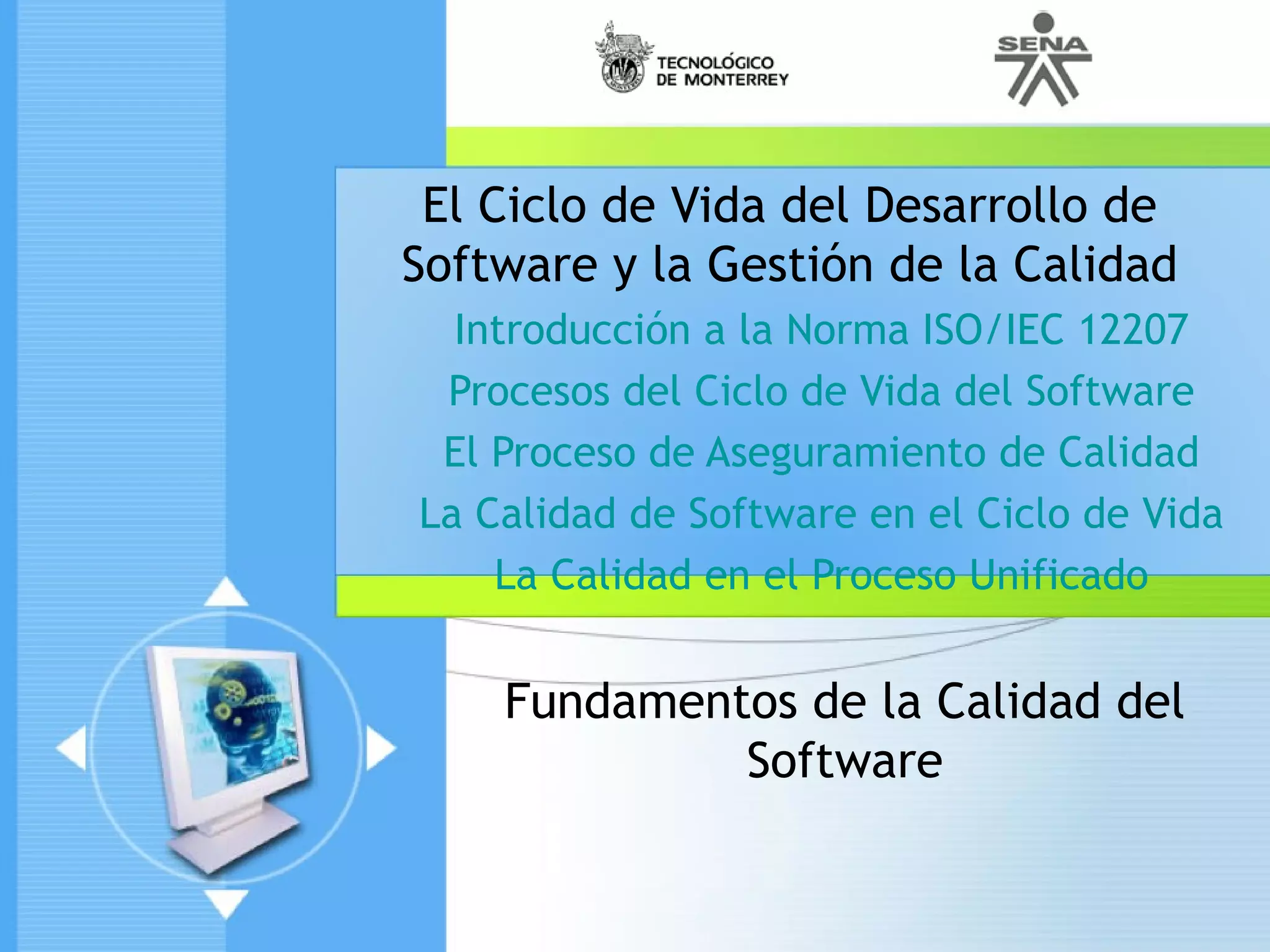 Este documento describe los fundamentos de la calidad de software y la gestión de la calidad a lo largo del ciclo de vida del desarrollo de software. Introduce la norma ISO/IEC 12207, la cual proporciona un marco de referencia común para los procesos del ciclo de vida del software. Explica los cinco procesos principales, ocho procesos de apoyo y cuatro procesos organizativos que componen la norma. También describe en detalle el proceso de aseguramiento de calidad, el cual es clave para garantizar