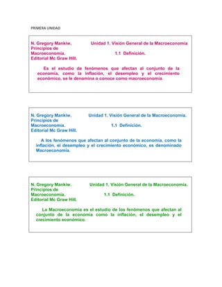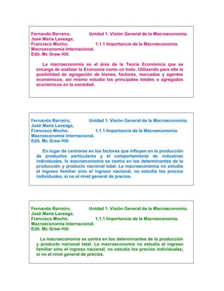 El documento trata sobre conceptos básicos de macroeconomía. Explica que la macroeconomía estudia fenómenos que afectan a toda la economía como la inflación, el desempleo y el crecimiento. Describe el flujo circular de la economía y variables macroeconómicas como el producto nacional, consumo e inversión. También habla sobre ciclos económicos y problemas como la inflación y el desempleo. Finalmente, explica los conceptos de curvas IS-LM y equilibrio en dichas curvas.