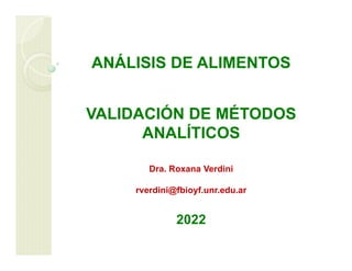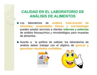El documento habla sobre la validación de métodos analíticos en laboratorios de análisis de alimentos. Explica que los laboratorios deben trabajar bajo normas como ISO/IEC 17025 para generar resultados confiables. También menciona a EURACHEM, que provee guías sobre validación de métodos y buenas prácticas. Finalmente, resume los principales aspectos que deben considerarse para la validación de métodos como la exactitud, rango, incertidumbre y sensibilidad.