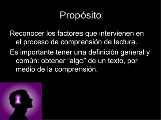 El documento define la lectura como un proceso de comprensión para obtener información de un texto. Explica que existen varias razones para leer, dependiendo de los propósitos e intereses del lector. También discute que la comprensión depende de la interacción entre el lector, el escritor y el texto, y que puede verse afectada por las experiencias y conocimientos previos del lector.