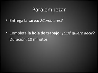La clase de español repasó adjetivos descriptivos y sus significados. Los estudiantes completaron una hoja de trabajo identificando si los adjetivos describían a un chico o una chica. Como tarea, cada estudiante creará un poema titulado "yo soy" usando 10 adjetivos para describirse a sí mismos.