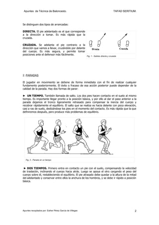 Este documento contiene apuntes sobre fundamentos ofensivos de baloncesto. Explica conceptos como la posición básica del jugador sin balón, los movimientos de los pies como arrancadas, paradas y pivotes, y el juego con balón incluyendo la recepción, protección y amenaza triple. También describe técnicas ofensivas como arrancadas, paradas y acciones secundarias con el balón en posesión.